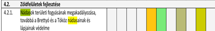 Itt az első sárga cella az Üdülő terület. Ebből az látszik, hogy jogilag a város elkötelezte magát a nádasok védelme érdekében, ami jelenleg úgy tűnik, hogy számukra a teljes elhanyagolást jelenti. Az, ahogy jelenleg például a Klapkán hagyják a nádast a padokkal szembeni területen elmocsarasodni (és tele van szeméttel is), véleményünk szerint nem a nádas fogyásának megakadályozása és védelme.